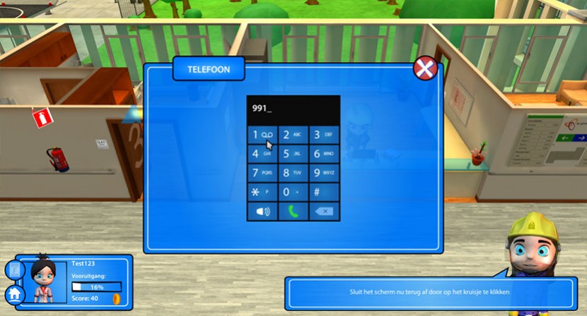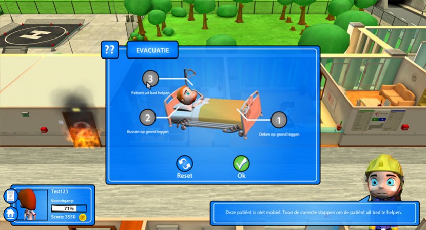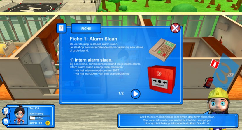 The player can personalise his/her character. He/she can choose from six different job profiles: doctor, manager, nurse, care worker, kitchen staff or technical staff. In the serious game the player is given fire prevention training based on three training and six practice parts. The new knowledge is gained using info sheets. Checking the acquisition of new skills, actions and attitudes is based on multiple choice questions and 3D animations. The serious game is also linked to an LMS system where the instructor and student can consult the learning outcomes. The LMS system allows a company or organisation to train and certify its personnel in a quick and simple manner. An online playable version of the serious game can be found at http://sggo.howest.be