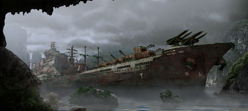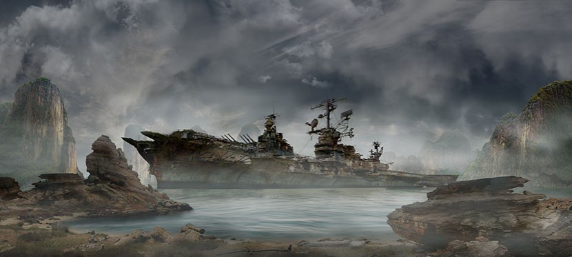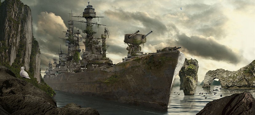 For this digital matte painting exercise we started from the idea that WW2 continued for some extra decades and the world powers built bigger and bigger battleships. Vessels like the -never built -"Führer Class" battleship. War ships so big they could carry entire armies and with the firepower of a whole armada. But so big as well, that they easily got stuck in shallow waters. They were abandoned after the war eventually ended and many years later, nature took over those wrecked war machines.