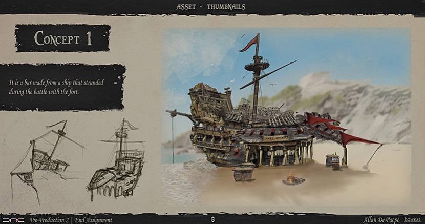 The pirate island had to contain a more fortified area and English guard tower to defend themselves. We needed to have a grounded and realistic feeling of the setting but at the same time attractive enough by applying various design principles.
