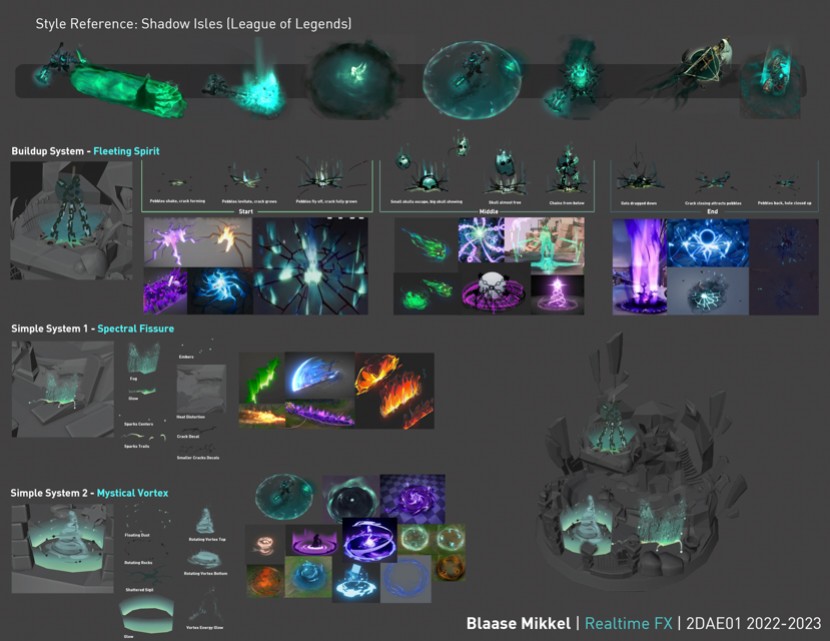 The first step involves the creation of a mood board, serving as a visual blueprint of their particle effects. They capture their desired atmosphere by featuring two simple yet dynamic particles that loop within the game level. Then a unique build-up is put together, compromising three distinct phases: Begin, Middle, and End. Each phase unfolds through three carefully designed steps bringing it up to a total of nine crucial stages.
