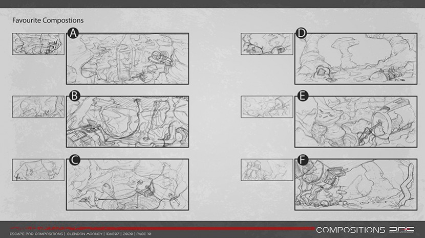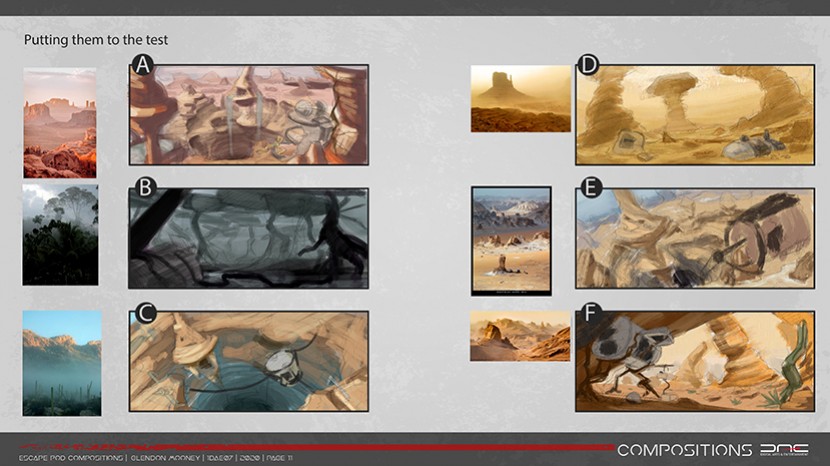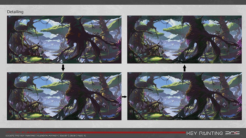 Each student worked out a production sheet consisting of ideations, compositions, mood studies, a final key painting and reference sheet.
